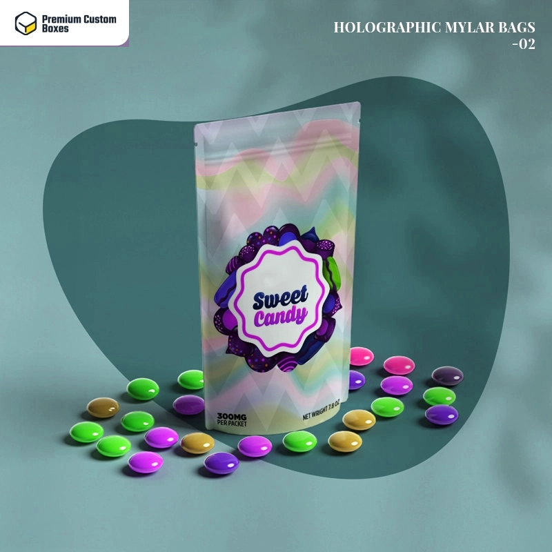 Made from shiny or reflective material, they emit various colorful visuals that make them prominent on the shelves and catch every eye. Premium Custom Boxes provide uniquely designed holographic packaging mylar bags with unlimited customizations, ensuring everyone designs mylar that not only reflects colors but also mirrors the brand image.